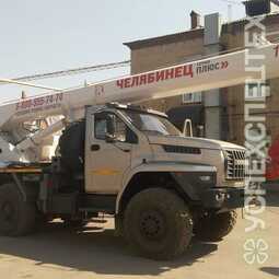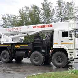 Автокран Челябинец КС-45734-19 смонтирован на вездеходном шасси Урал 5557, оборудован съемной двухместной монтажной люлькой, грузоподъемность которой составляет 250 кг, позволяет выполнять работы по обслуживанию зданий и сооружений, линий электропередач и связи, воздуховодов и других работ, требующих подъема людей на высоту до 22,0 метров. -