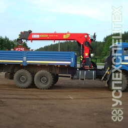 Погрузку и разгрузку грузов на бортовую платформу автомобиль производит кран манипулятор ИФ-300, установленной за кабиной. КМУ ИФ-300 обеспечивает проведение грузоподъемных работ весом до 9 тонн. -