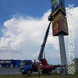 СпецификацияАвтовышка МАЗ комбинированная стрела Телескоп-колено с 32 м - имеет комбинированную, телескопическую и коленчатую стрелы, способна поднять груз 250 кг на высоту 32 метра, используется для различных строительных работ, установки рекламных щитов и других задач;