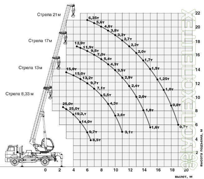 Описание вылет стрелы 21 м, высота подъема 21,6 м