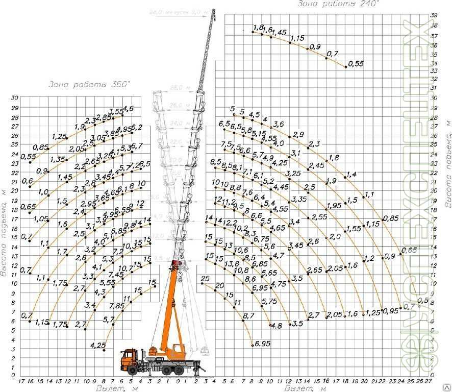 Колесная формула 4х2 Двигатель Cummins ISB6.7E5 Мощность, л.с. 300 Грузоподъемность, кг 16 000 Грузовой момент, т*н 48 Опорный контур, м 5,2х4 Длина стрелы, м 8-18 Длина гуська, м 7 Наибольшая высота подъема, м: - с основной стрелой 18,4 - с гуськом 25 Вылет, м: - с основной стрелой 1,9-17 - с гуськом 8-17 Скорость подъема/опускания груза при 8-кратной запасовке грузового каната, м/мин 0,2-7,5 Макс. скорость подъема/опускания крюка, м/мин 35 Скорость посадки, м/мин 0,2 Частота вращения, мин(-1) 0,3-2,5 Скорость передвижения, км/ч 60 Габаритные размеры в транспортном положении (длина/ширина/высота), мм 10 000/2 500/3 990 Полная масса с гуськом, т 17,1