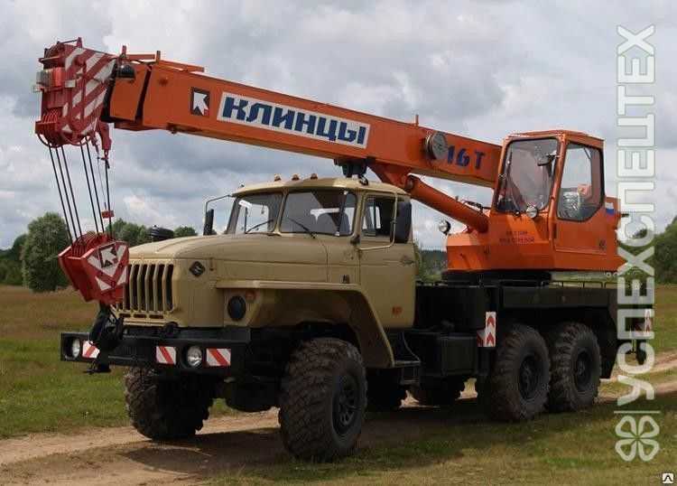 Автокран Клинцы КС-35719-3-02 грузоподъемностью 16 тонн смонтирован на 3х-осном вездеходном шасси Урал 5557, с колесной формулой 6х6.