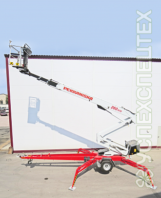 Прицепной подъемник пригодится в тех случаях, когда использование стреловых самоходных подъемников невозможно из-за слабой несущей способности грунта. Он имеет сравнительно малый вес и гидравлические опоры. Управление может осуществляться как из корзины, так и снизу. В качестве источника питания прицепного подъемника используется обычная однофазная электросеть (230 В). Эти подъемники имеют стрелу телескопического или коленчатого типа, а также привод бокового поворота рабочей корзины. Преимущество прицепных подъемников – это небольшой вес, большой вылет стрелы, возможность буксировки.