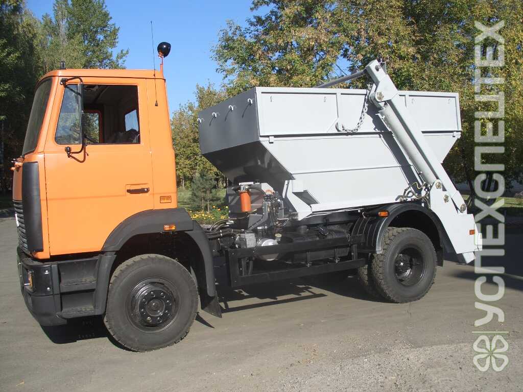 Мусоровоз контейнерный КО-440А1 предназначен для кузовной системы cбора и вывоза крупногабаритного бытового и строительного мусора, а также для перевозки и самосвальной выгрузки различных сыпучих и крупногабаритных грузов.