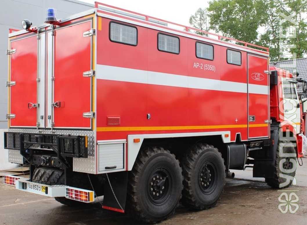 Колесная формула 6х6. Полная масса пожарного автомобиля, кг 16150. Габаритные размеры (ДхШхВ), м 8250х2550х3700. Боевой расчет, включая водителя, чел. 2/3. Пожарный рукавный автомобиль АР-2 на шасси КАМАЗ- это специальный пожарный автомобиль предназначенный для тушения пожаров в населенных пунктах и на промышленных объектах совместно с пожарными автонасосными станциями и служит для доставки к месту пожара боевого расчета, пожарно-технического вооружения, механизированной прокладки и сбора магистральных рукавных линий и подачи в очаг пожара воды или воздушно-механической пены с помощью стационарного лафетного ствола.