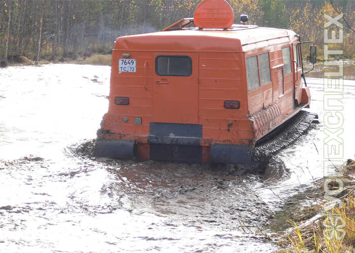 Продукт сертифицирован. Гусеничная плавающая машина высокой прорходимости предназначена для перевозки грузов и монтажа различного оборудования на платформе закрытой тентом. Машина имеет 6-ти местный салон. Организуется 2 полноценных спальных места. По требованию Заказчика машина может быть оборудована погрузо-разгрузочными устройствами. Эксплуатируется на грунтах с низкой несущей способностью, включая снежную целину без ограничения глубины снежного покрова, сыпучие пески, болота всех категорий и открытые водоемы. На большие расстояния машина может транспортироваться в кузове автомобилей типа КАМАЗ, МАЗ.