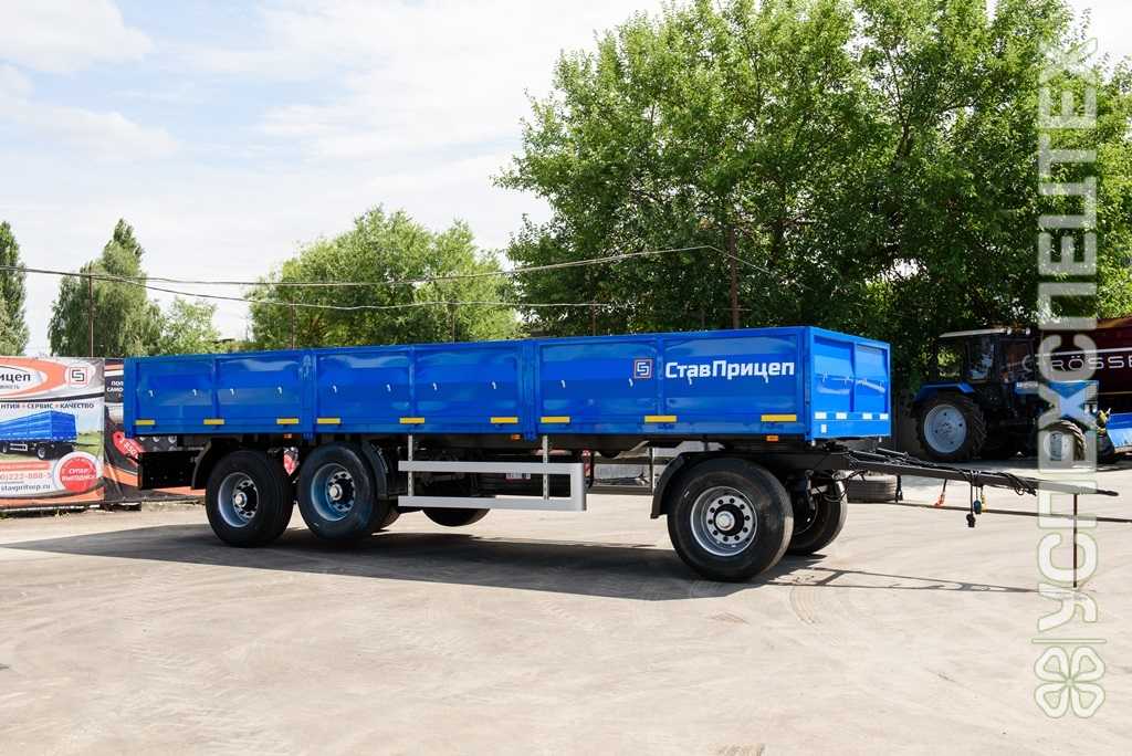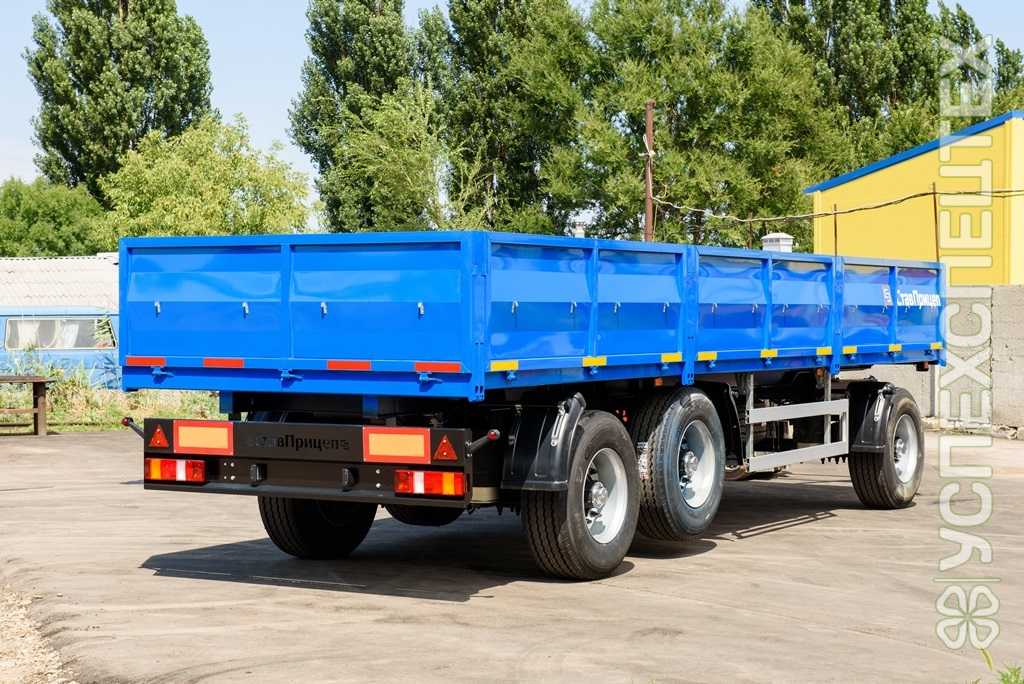 Прицеп бортовой предназначен для транспортировки различных грузов, в том числе сыпучих, а так же зерновых сельскохозяйственных культур. Бортовая платформа: стальная, прямоугольного сечения. Боковые и задние борта платформы сочленены из двух бортов. Верхний борт – неподвижный, жестко крепится к стойкам платформы. Нижний борт – подвижный с верхней навеской, шарнирно крепится к нижней кромке верхнего неподвижного борта. Запоры бортов – механические, открываются вручную. Конструкция платформы включает в себя две пары стяжек средних стоек, увеличивающих жесткость кузова в поперечном направлении. Платформа оснащена быстросъемным тентом. Тент сворачивается в продольном направлении с помощью наматывающего устройства. В передней части платформы имеется откидная площадка для удобства обслуживания тента.