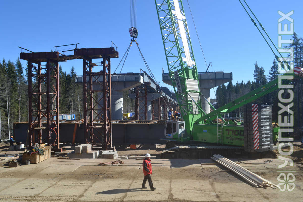 Гусеничный кран SENNEBOGEN 5500 оснащен главной стрелой 35,50 м. Он надежно поднимает многотонные мостовые блоки и устанавливает их на нужную позицию. Кран грузоподъемностью 180 т приводится в действие дизельным двигателем мощностью 261 кВт.