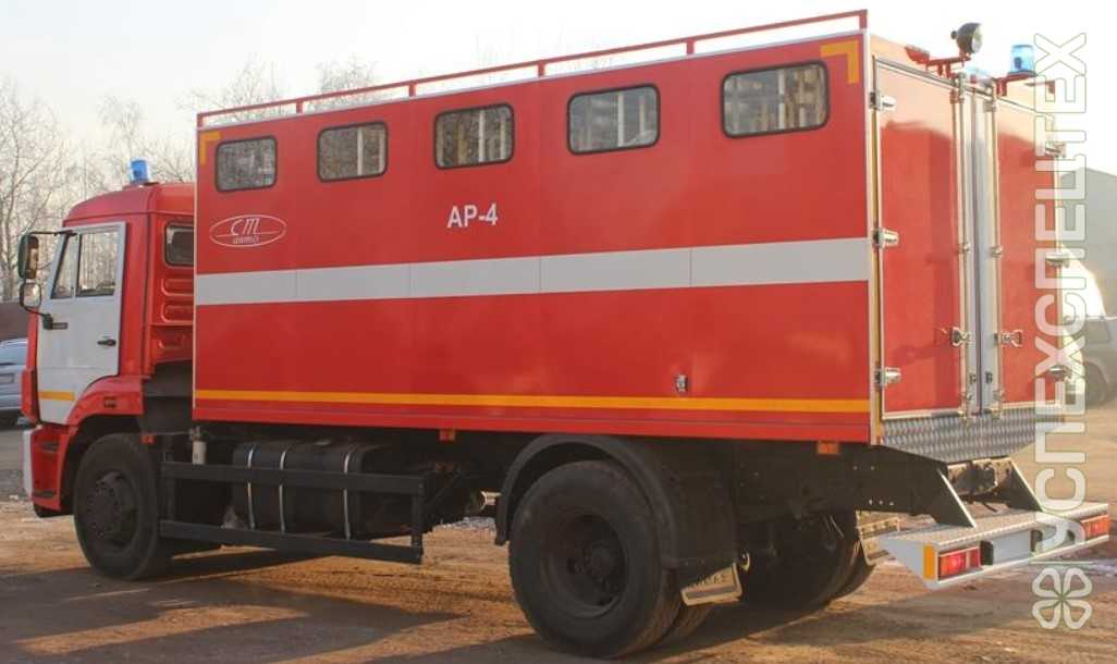 Колесная формула 4х2. Полная масса пожарного автомобиля, кг 14725. Габаритные размеры (ДхШхВ), м 7550х2500х3700. Боевой расчет, включая водителя, чел. 2/3. Пожарный рукавный автомобиль АР-4 на шасси КАМАЗ- это специальный пожарный автомобиль предназначенный для тушения пожаров в населенных пунктах и на промышленных объектах совместно с пожарными автонасосными станциями и служит для доставки к месту пожара боевого расчета, пожарно-технического вооружения, механизированной прокладки и сбора магистральных рукавных линий и подачи в очаг пожара воды или воздушно-механической пены с помощью стационарного лафетного ствола.