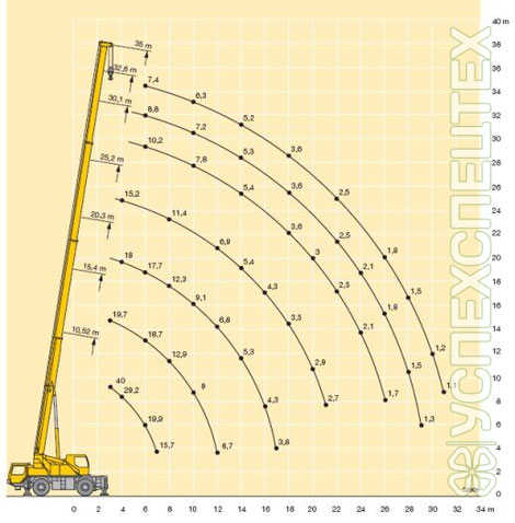 Грузоподъемность 40 тонн, Вылет стрела 30+14.5 м. удлинитель