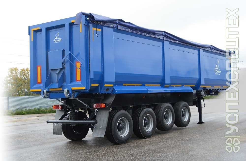 Представленная модель 95402-0000050 – это вариант с повышенной грузоподъемностью (95,700 кг) с усиленной ходовой частью и подвеской. Конструкция бортов (из двух частей) предотвращает засыпание колес при разгрузке. Управление разгрузкой в данной модели осуществляется с выносного пульта, который подключается к панели слева за кабиной тягача.