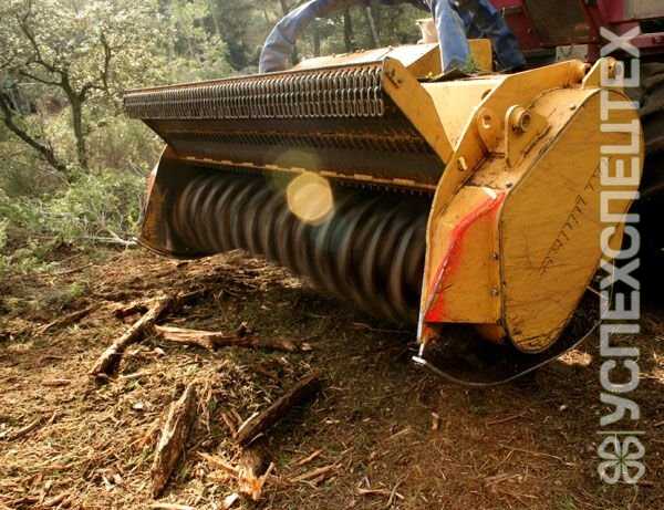срезает и измельчает деревья, пни, кусты диаметром до 40 см;