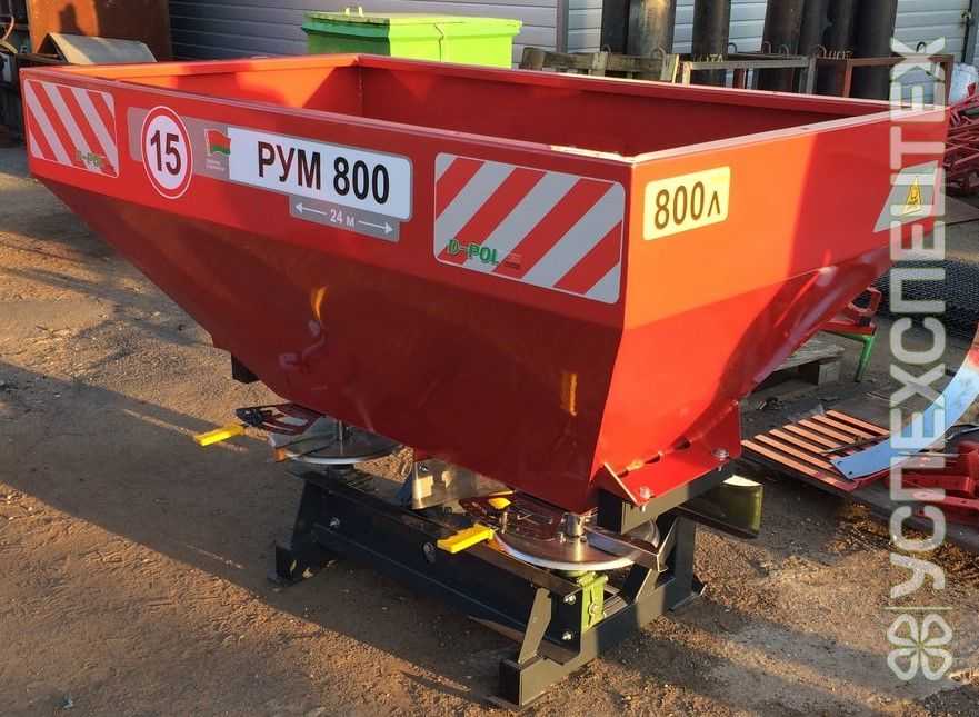 Разбрасыватель минеральных удобрений D-POL РУМ-800 предназначен для внесения сухих удобрений, агрегатируется с тракторами мощностью не менее 22 лошадиных сил, в действие приводится от вала отбора мощности при помощи кардана.
