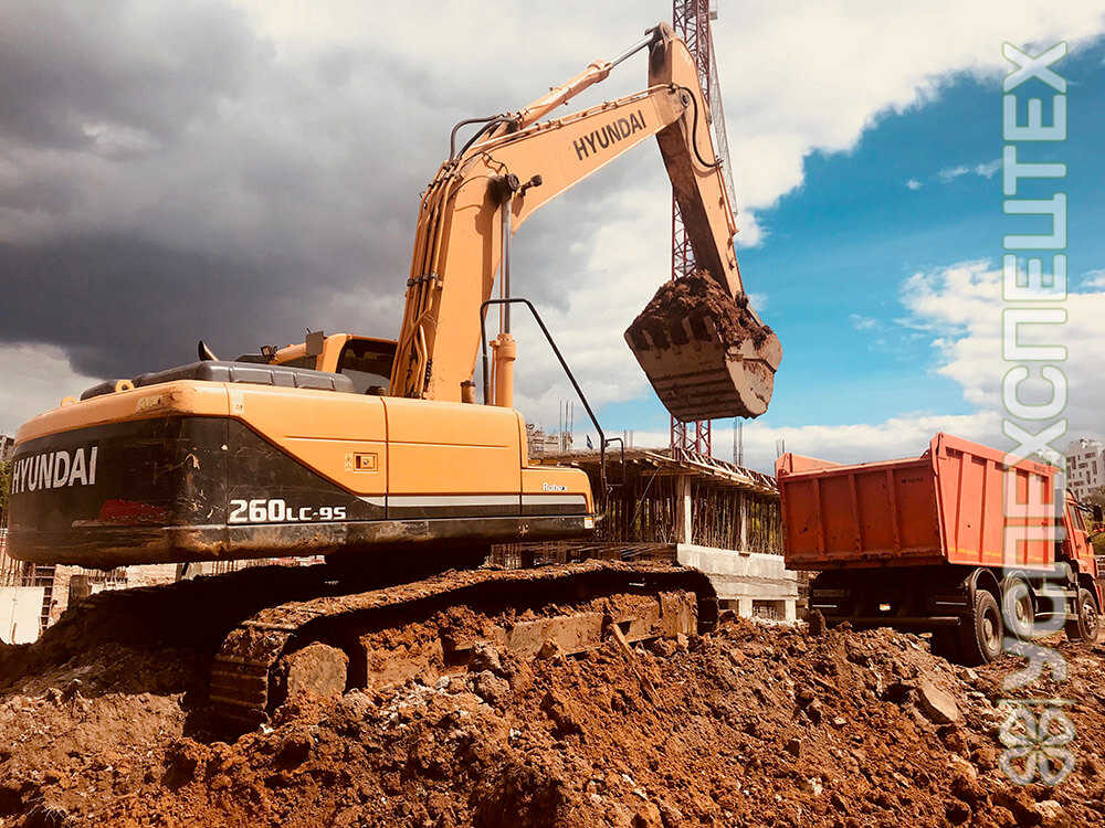 Разработка котлована с применением техники оптимальной мощности и размеров. Рытье траншей. Вывоз грунта.