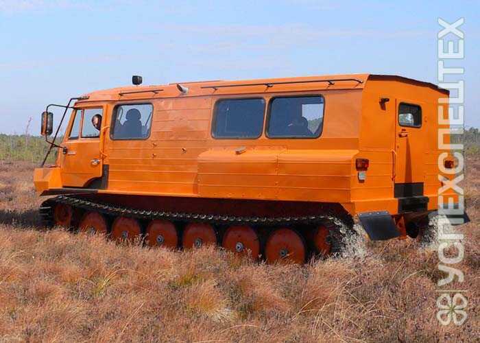 Продукт сертифицирован. Гусеничная плавающая машина высокой прорходимости предназначена для перевозки грузов и монтажа различного оборудования на платформе закрытой тентом. Машина имеет 6-ти местный салон. Организуется 2 полноценных спальных места. По требованию Заказчика машина может быть оборудована погрузо-разгрузочными устройствами. Эксплуатируется на грунтах с низкой несущей способностью, включая снежную целину без ограничения глубины снежного покрова, сыпучие пески, болота всех категорий и открытые водоемы. На большие расстояния машина может транспортироваться в кузове автомобилей типа КАМАЗ, МАЗ.