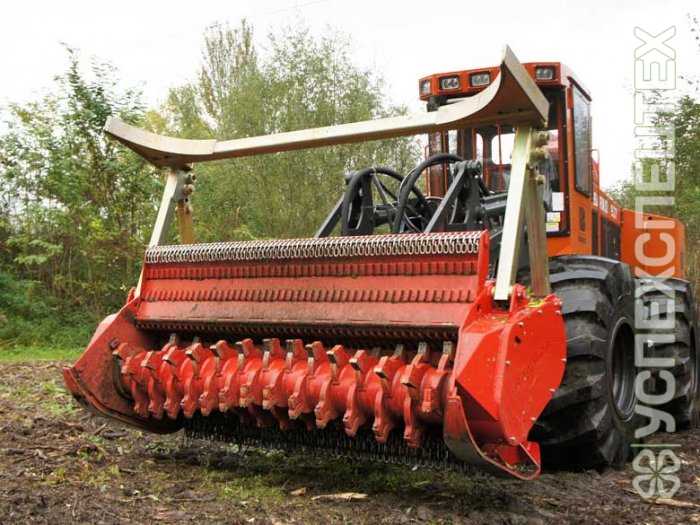 срезает и измельчает деревья, пни, кусты диаметром до 40 см;